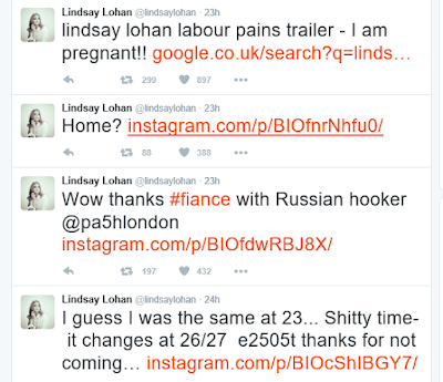 "Home? First time in my life-bare with he/ he cheated on me with hooker #meangirls #meanboysu b."An hour later she tweeted a picture of herself with a baby bump from her 2009 movie Labor Pains, about a woman who pretends to be pregnant. "Lindsay Lohan labour pains trainer – I am pregnant!!"
